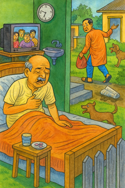 বাড়ীর বুড়োকত্তা অবশ্য দেরীতে আসা বা নোংরা কাগজ- কোনোটা নিয়েই কিছু বললেন না। শুধু বারান্দায় এতো ঘেউঘেউ করে কুকুর ডাকছে কেন, জিজ্ঞেস করলেন বিরক্তমুখে। আসলে কাজের লোকটি ঢোকার সময় বাগানের গেটটা বন্ধ করতে ভুলে গেছে, তাই ফাঁক পেয়ে ভেতরে সেঁধিয়েছে হতচ্ছাড়ারা। অগত্যা তাকেই গিয়ে আবার তাড়িয়ে আসতে হল। গেট-টেট বন্ধ করে ঘরে ঢুকেই নজরে পড়ে তার- কত্তার বিছানার পাশের টেবিলে জলভর্তি গ্লাসটা যেমনকার তেমন রয়েছে প্লেট ঢাকা দেওয়া। তার মানে নিশ্চয়ই কাল রাতে শোবার আগে ওষুধগুলো খেতে ভুলেছেন। শরীরে রোগের ত্রিবেণীসঙ্গম তাঁর- হার্টের ব্যামো, গাঁটের ব্যামো আর পেটের ব্যামোতে মাঝেমাঝেই শয্যাশায়ী থাকেন। হার্টের রুগী এই কয়েক বছর যাবৎ, কিন্তু পেটের গন্ডগোল আর গাঁটের ব্যথা বহুযুগের পুরোনো। প্রথম প্রথম গোঁ ছিল হোমিওপ্যাথি-কবিরাজী ছাড়া দেখবেন না। তারপর তাদের ভুল চিকিৎসায় অবস্থা খারাপের দিকে গড়াচ্ছে দেখে বাধ্য হয়ে অ্যালোপ্যাথি ডাক্তারের গাদা গাদা বড়ি গেলা শুরু করলেন যখন, ততদিনে বেশ একটু দেরীই হয়ে গেছে। এখন উঠতে ওষুধ, বসতে ওষুধ, শুতে ওষুধ।