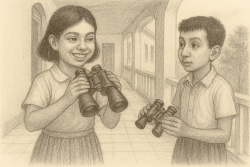টিফিনের সময় যখন সবাই একে–একে বেরিয়ে গেল ক্লাস থেকে, তাতান দেখে পুপু মুখে অহংকার ফুটিয়ে ব্যাগ থেকে বার করল একটা চমৎকার বাইনোকুলার৷ ঘন কালো রঙের, লম্বাটে গড়ন, দুদিকে দুটো লম্বা চোঙ৷ টিফিনটাইমে তিনতলার বারান্দায় দাঁড়িয়ে চোখে লাগিয়ে ঘুরিয়ে ফিরিয়ে দেখছিল সামনের মাঠটায়৷ হঠাৎ কী মনে হতে তাতনের হাতে ধরিয়ে দিয়ে বলল, দ্যাখ, তাতান, বাংলা স্যারকে কেমন দ্যাখাচ্ছে এখান থেকে।